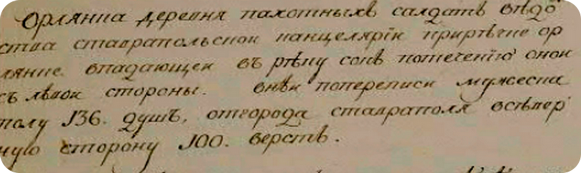 Как мы видим из "Лексикона " Рычкова деревня расположилась на левом берегу одноименной речки,рядом с Нижне Орлянским редутом(в настоящее время на правом берегу).Проживало в ней 136 душ мужского пола.Был ещё и Верхне Орлянский редут к сожалению он не сохранился.К редутам была приписана 1 конная  рота Билярского полка ландмилиции (102 чел.)