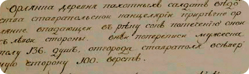Как мы видим из "Лексикона " Рычкова деревня расположилась на левом берегу одноименной речки,рядом с Нижне Орлянским редутом(в настоящее время на правом берегу).Проживало в ней 136 душ мужского пола.Был ещё и Верхне Орлянский редут к сожалению он не сохранился.К редутам была приписана 1 конная рота Билярского полка ландмилиции (102 чел.)